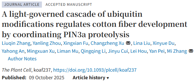 PIN-formed(PIN)蛋白介导的极性生长素运输在植物的光形态建成中发挥了重要的作用。然而,光信号如何精准调控PIN蛋白定位,一直是植物学领域的未解之谜。近日,西南大学农学与生物科技学院张觅课题组在植物学权威期刊The Plant Cell上发表题为A light-governed cascade of ubiquitin modifications regulates cotton fiber development by coordinating PIN3a proteolysis的研究论文,揭示了光信号通过级联泛素化修饰控制PIN3a蛋白稳定性,调控棉花纤维发育的新机制。