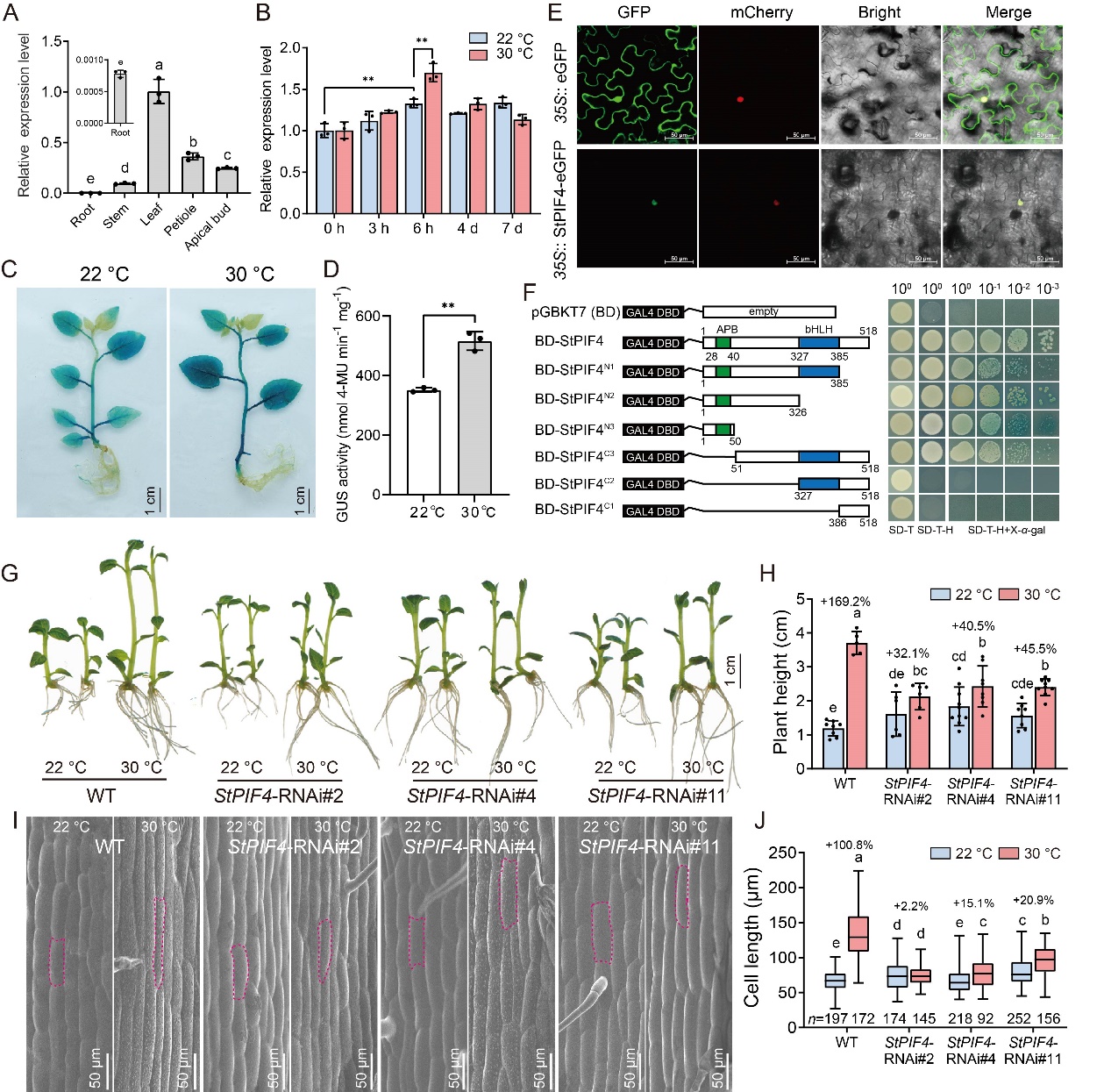 我们在马铃薯基因组中鉴定出一个核-质体双定位蛋白StHEMERA (StHMR)。功能分析表明,StHMR 是马铃薯热形态建成的关键调控因子。StHMR 沉默(RNAi)株系在高温条件下株高和茎表皮细胞长度几乎无显著增加,表现出高温不敏感表型;而 StHMR 过表达株系在高温下的株高和细胞伸长响应与野生型无显著差异(图2)。分子机制研究发现,StHMR 可与光敏色素相互作用因子 4(StPIF4)互作(图3)。功能验证显示,StPIF4 沉默株系在高温下的株高增加和细胞伸长显著受抑制(图4),证实其对马铃薯高温诱导的茎伸长至关重要。靶基因筛选和验证发现,StPIF4 可直接结合生长素合成基因StYUC8和细胞伸长基因StEXPA8启动子中的 E-box(CANNTG)顺式作用元件,激活这些基因的转录表达,进而调控马铃薯细胞伸长。StHMR作为转录共激活因子,显著增强StPIF4对StYUC8的转录激活能力,且这种增强效应在高温条件下更为显著(图5)。综上,该研究阐明了 StHMR-StPIF4 模块在马铃薯温度适应中的进化保守性与物种特异性,为通过分子育种改良马铃薯的高温适应性提供了重要的理论依据和候选基因资源。