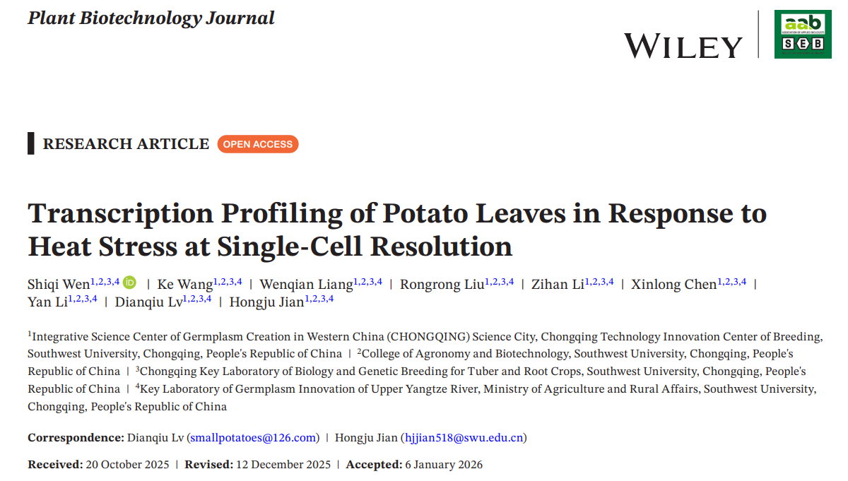 近日,西南大学农学与生物科技学院吕典秋课题组在Plant Biotechnology Journal上发表题为Transcription profiling of potato leaves in response to heat stress at single-cell resolution的研究论文。该研究首次在单细胞水平解析了马铃薯细胞对热胁迫的特异性响应机制,绘制了一个包含超过77,000个有效细胞的单细胞时空转录图谱,构建了细胞类型特异性响应高温的转录调控网络,揭示了热胁迫下植物叶片的细胞异质性和分化轨迹,鉴定了马铃薯叶片对热胁迫响应的关键核心基因,发现表皮细胞是应对热胁迫的关键细胞群,为培育耐高温马铃薯种质提供了新的策略和靶点。