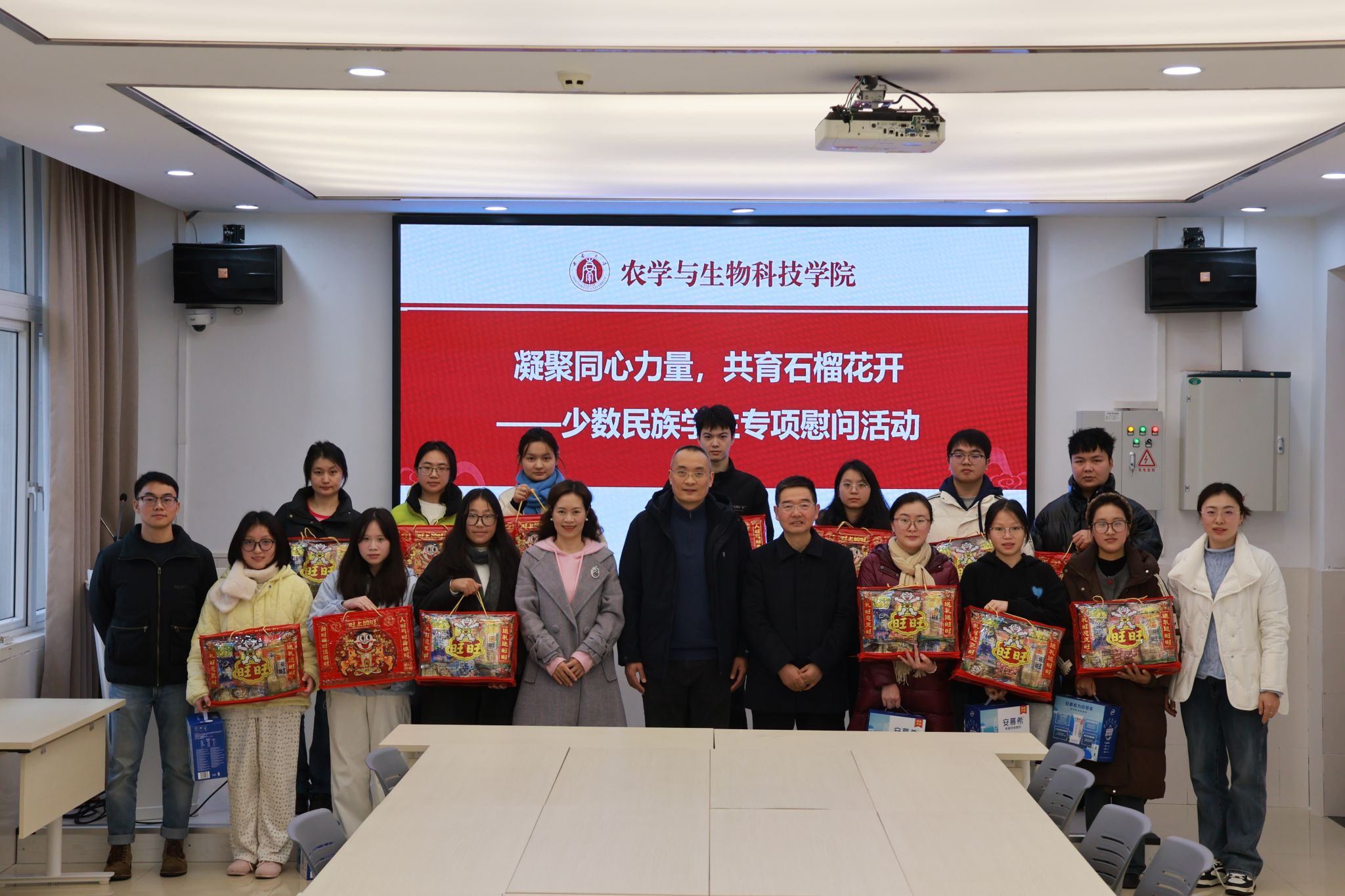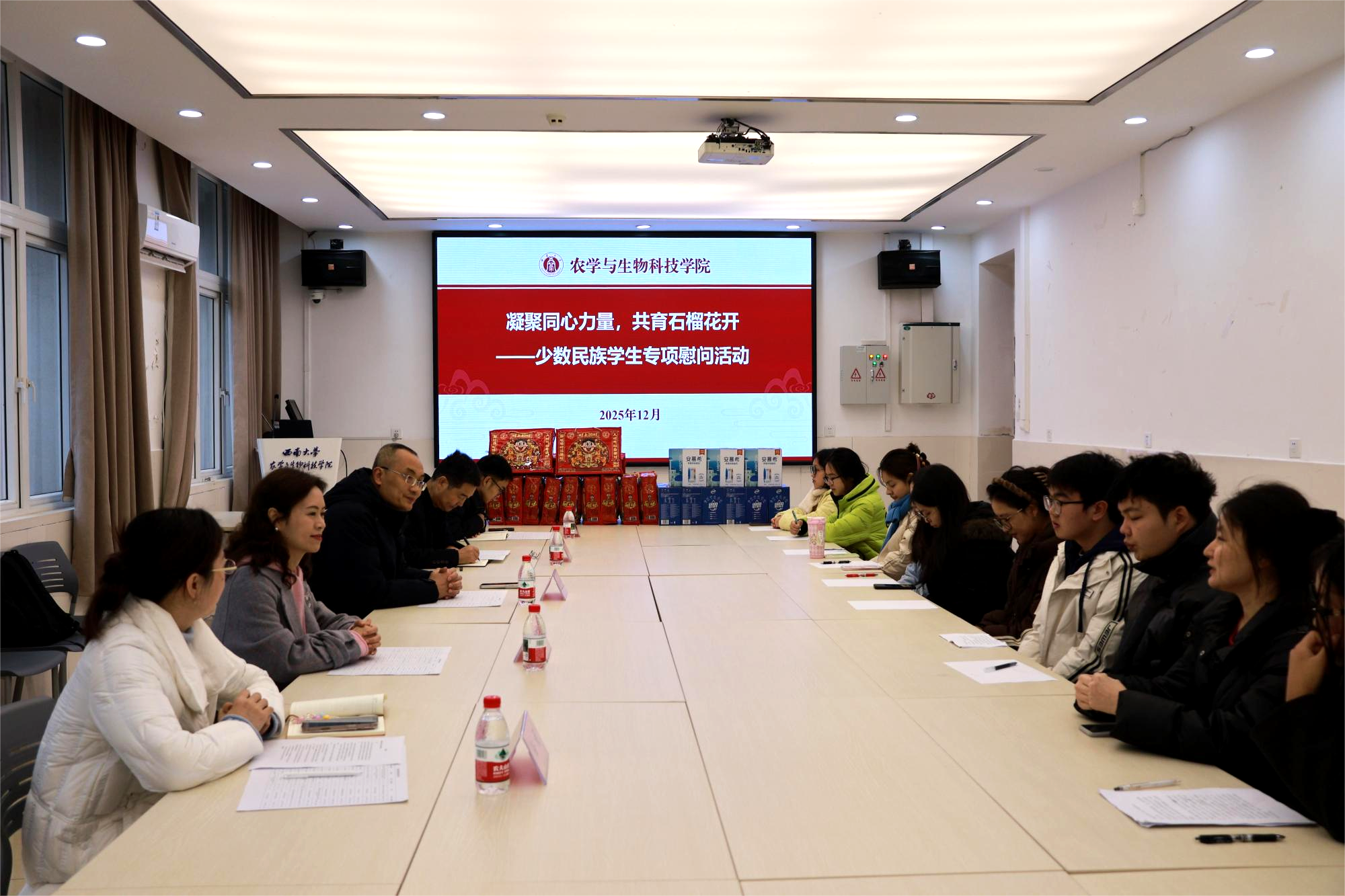为持续强化学风建设,夯实学业根基,传递学院对少数民族学生的温暖关怀,12月24日,农学与生物科技学院在37教207会议室举办少数民族学生专项慰问活动。学院党委书记阳义健、党委副书记刘秋艳、副院长张建奎出席活动,全体辅导员以及少数民族学生代表参会。