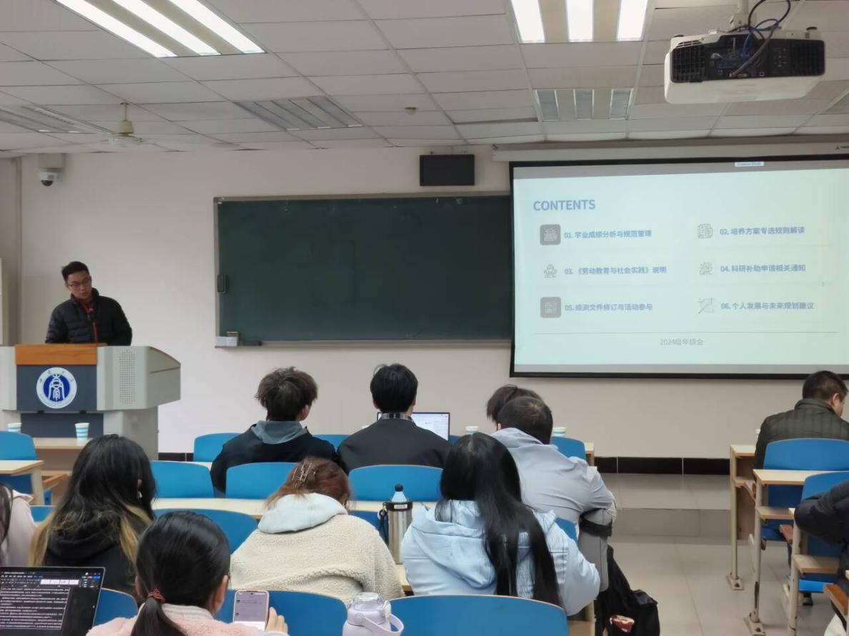 年级会环节,辅导员王皓老师围绕学业管理、培养方案、劳动教育、科研补助、综测修订及安全教育等等方面明确要求、强调重点。他展示了各班级平均学分绩点与最高绩点分布,勉励同学们以优秀为镜、不满足现状、追求进步;详细解读了跨专业选修、通识必修课及国际周课程的学分要求,提醒大家对照培养方案做好规划;同时就防范电信诈骗、宿舍消防安全、课堂纪律与网络文明等作了重点提醒,希望同学们时刻绷紧安全弦,以积极的状态迎接新学期。