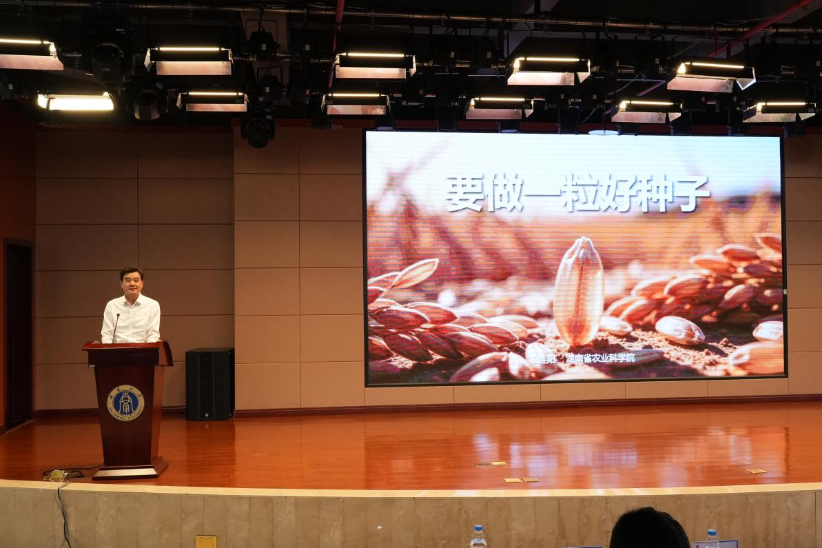 中国工程院院士柏连阳在会上作了“要做一粒好种子”的主题分享。柏连阳院士结合与袁隆平院士共事的亲身经历,深情讲述了袁老的感人日常与科研风范。他寄语青年学子深入学习袁隆平精神,一是心怀家国,扎根田野,始终瞄准祖国和人民的现实需求确定研究方向;二是潜心钻研,协作攻关,既要敢于质疑权威,更要有海纳百川的团队精神;三是乐观务实,全面发展,在求知的同时强健体魄、涵养身心。柏连阳院士指出,袁隆平院士用毕生心血捍卫国家粮食安全、泽被苍生,是对科学家精神的生动践行。他勉励同学们以袁老为楷模,把青春和论文书写在祖国广袤的大地上。