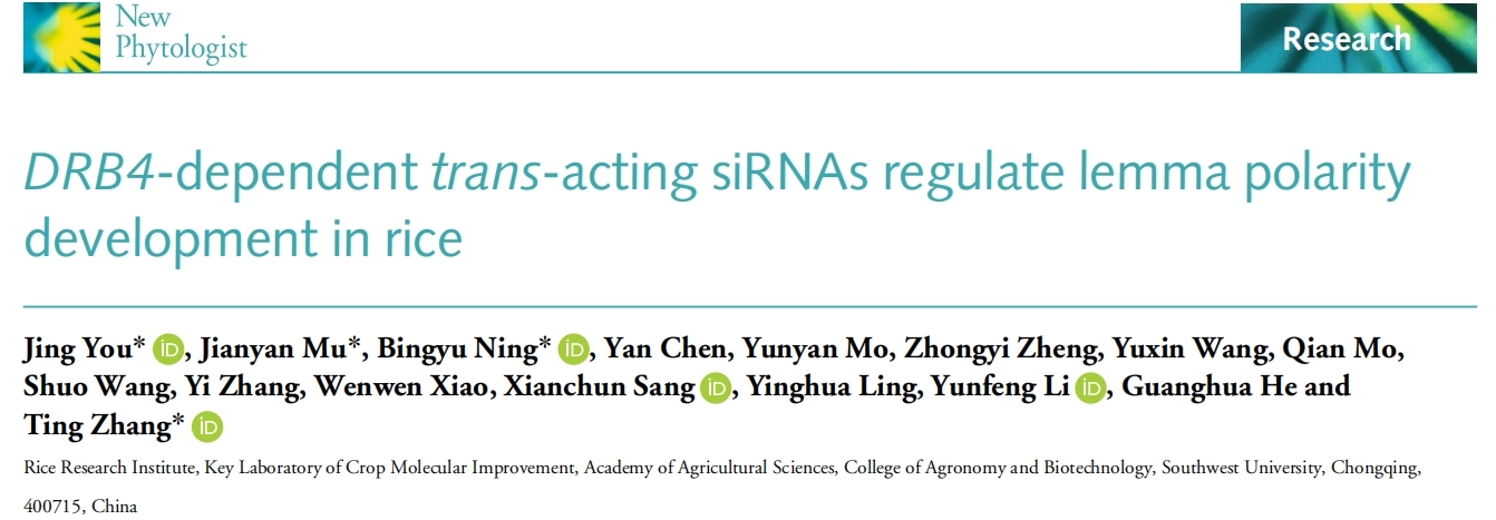 近日,西南大学农学与生物科技学院水稻研究所在《New Phytologist》在线发表题为“DRB4-dependent trans-acting siRNAs regulate lemma polarity development in Rice”的研究论文,揭示了一条由DRB4介导的小RNA调控通路在水稻外稃极性建成中的关键作用,为解析水稻花器官形态建成机制及分子设计育种提供了新的理论依据。