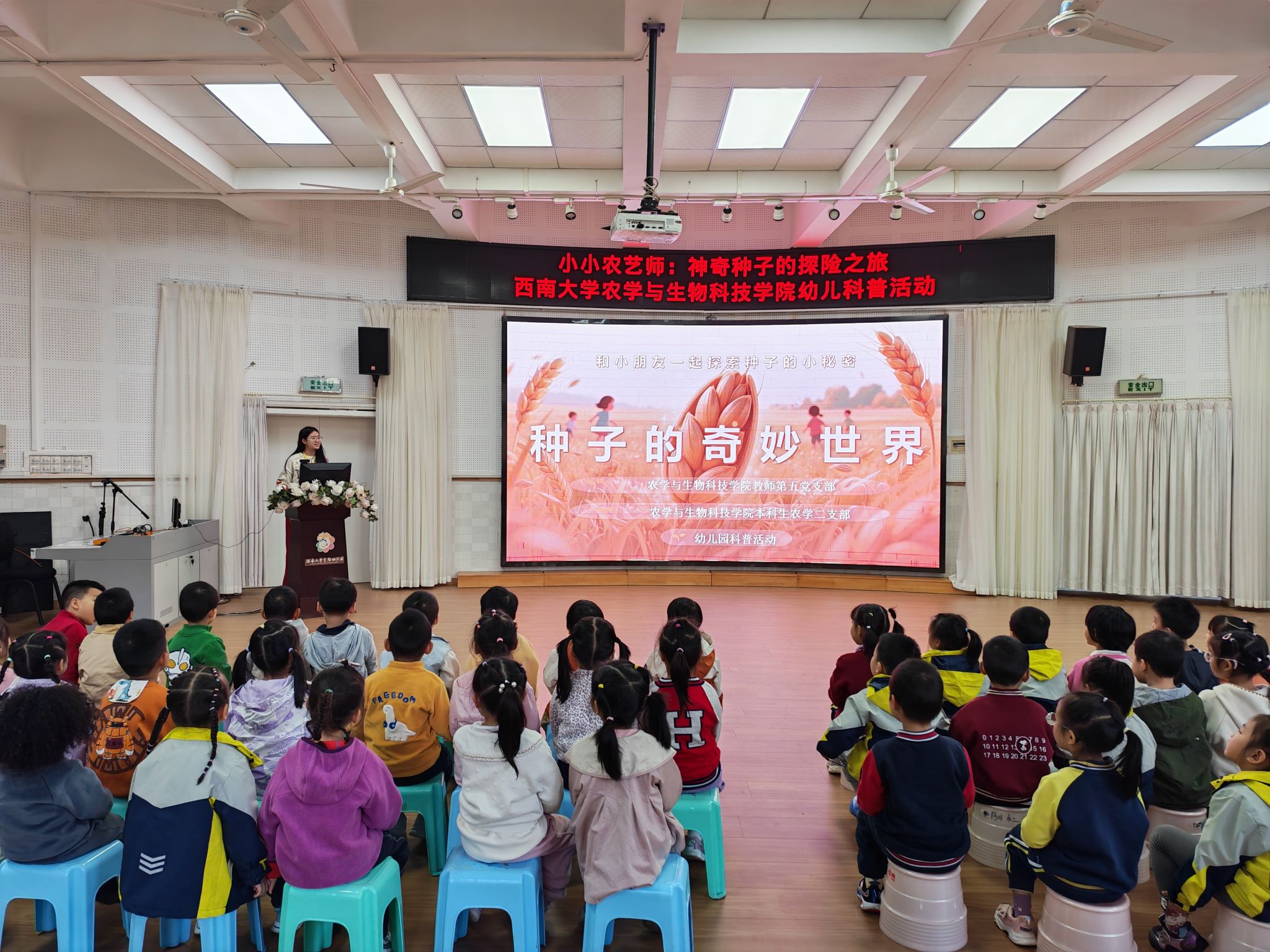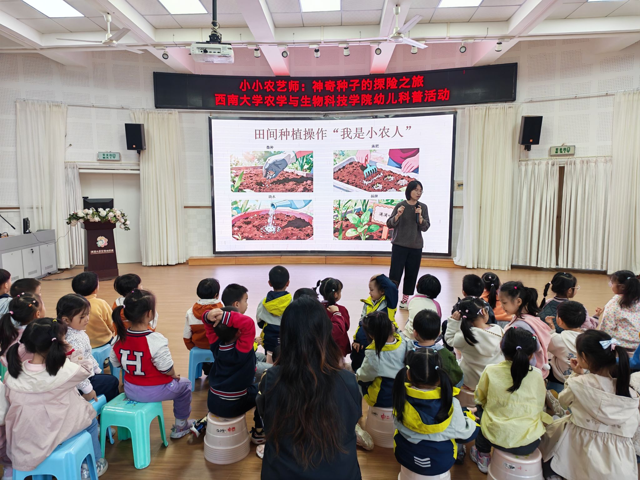 为充分发挥农学专业优势,助力幼儿科学认知启蒙,2025年11月4日上午,西南大学农学与生物科技学院教师第五党支部联合本科生农学第二党支部、本科生农学第一党支部志愿者共同走进西南大学实验幼儿园(北区),为中班、大班小朋友开展“小小农艺师:神奇的种子探险之旅”科普活动。